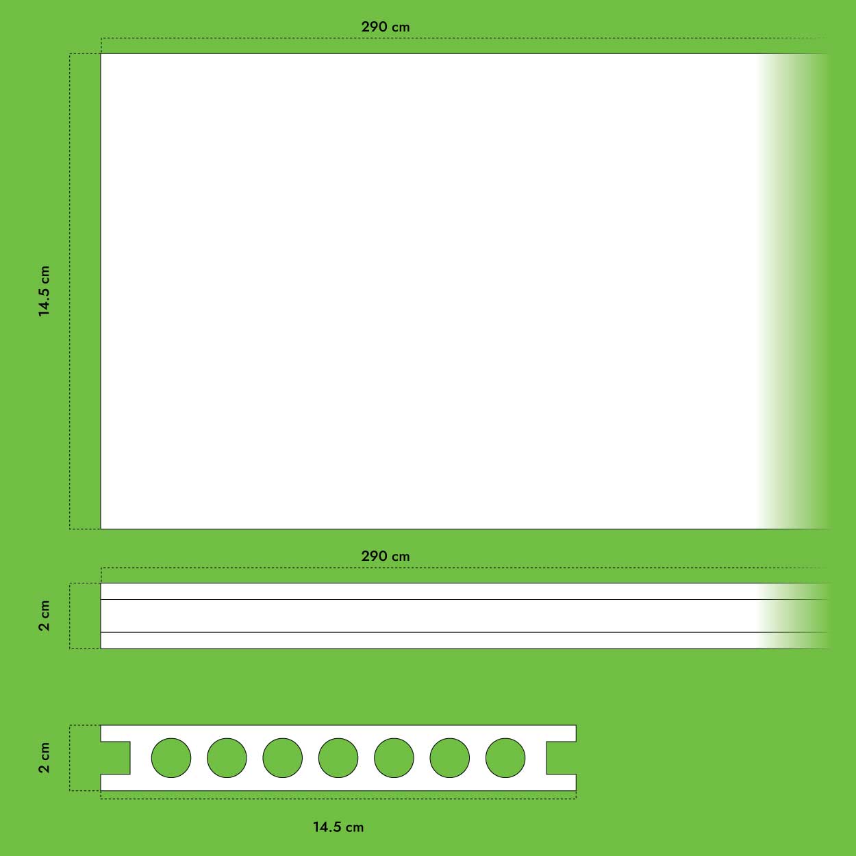 Dimensiones: 290 x 14,5 x 2 cm por tabla.